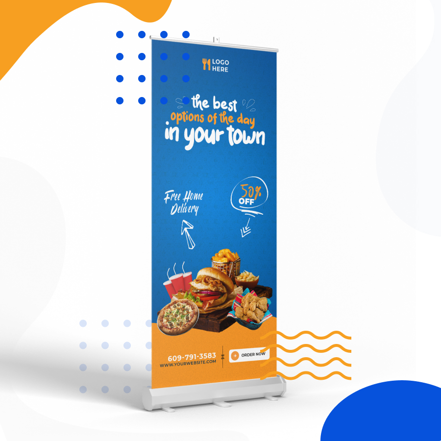 Roll up banner adalah media pemasaran yang menawarkan produk atau jasa dari suatu perusahaan dan instansi tertentu. Roll up banner memiliki bentuk yang mudah digunakan. Karena bentuknya gulung, ukurannya menjadi mudah dibawa. Roll up banner memuat informasi yang hampir sama dengan X Banner dan Y Banner, yang membedakannya adalah tampilan Roll up banner tampak lebih kokoh karena terbuat dari bahan stainless dan alumunium yang membuatnya mampu berdiri tegak.